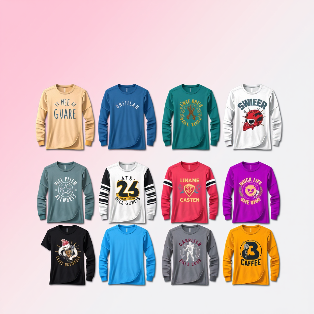 1 userTransform your wardrobe with AI-generated long sleeve T-shirt designs. This tool creates a diverse, trendy grid of 12 unique shirts, perfect for fashion enthusiasts and online retailers seeking fresh, eye-catching apparel concepts.