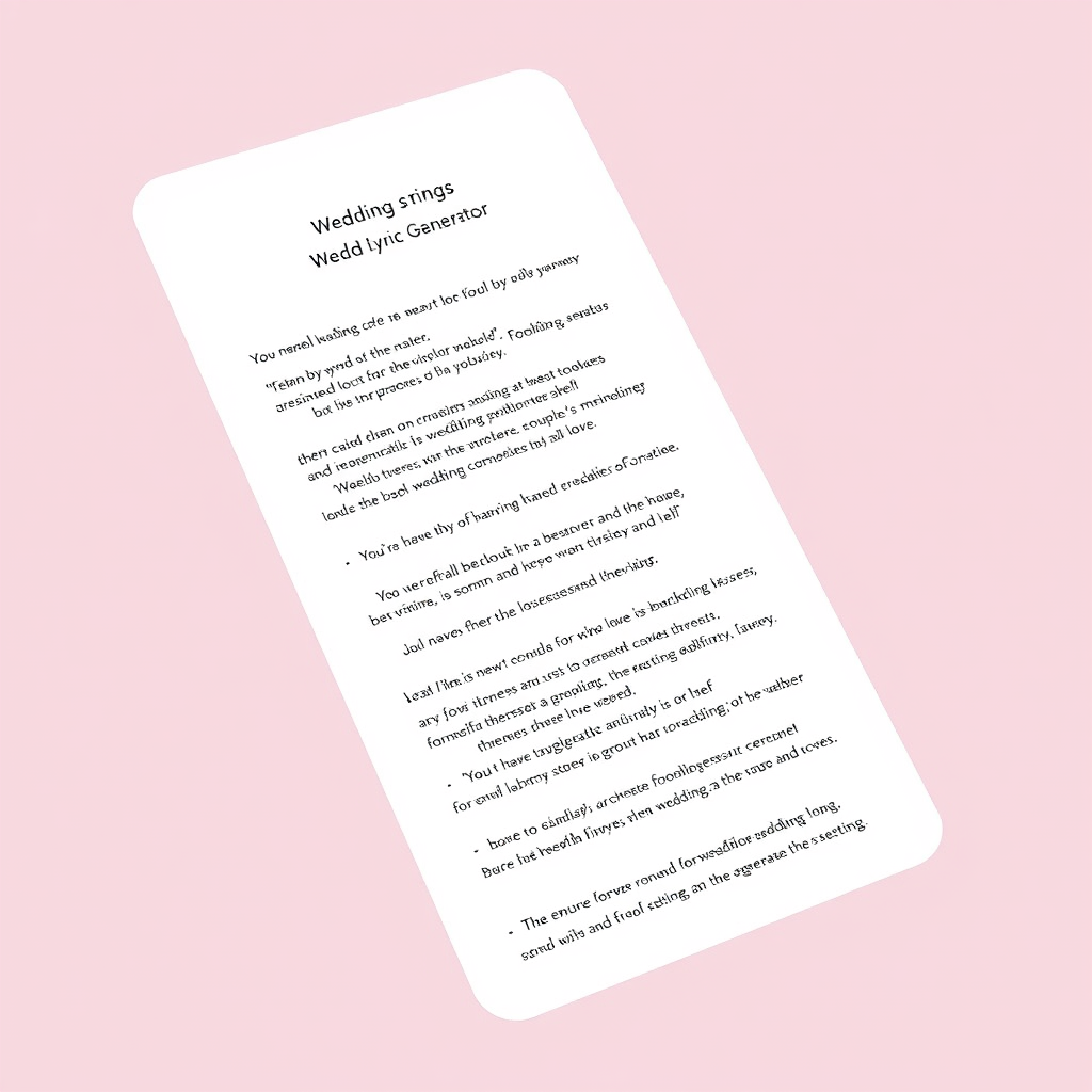 14 usersCraft personalized wedding song lyrics with AI. Input your love story, memories, and preferences, and receive custom-tailored verses celebrating your unique journey. Perfect for couples seeking a heartfelt, one-of-a-kind musical expression of their love.