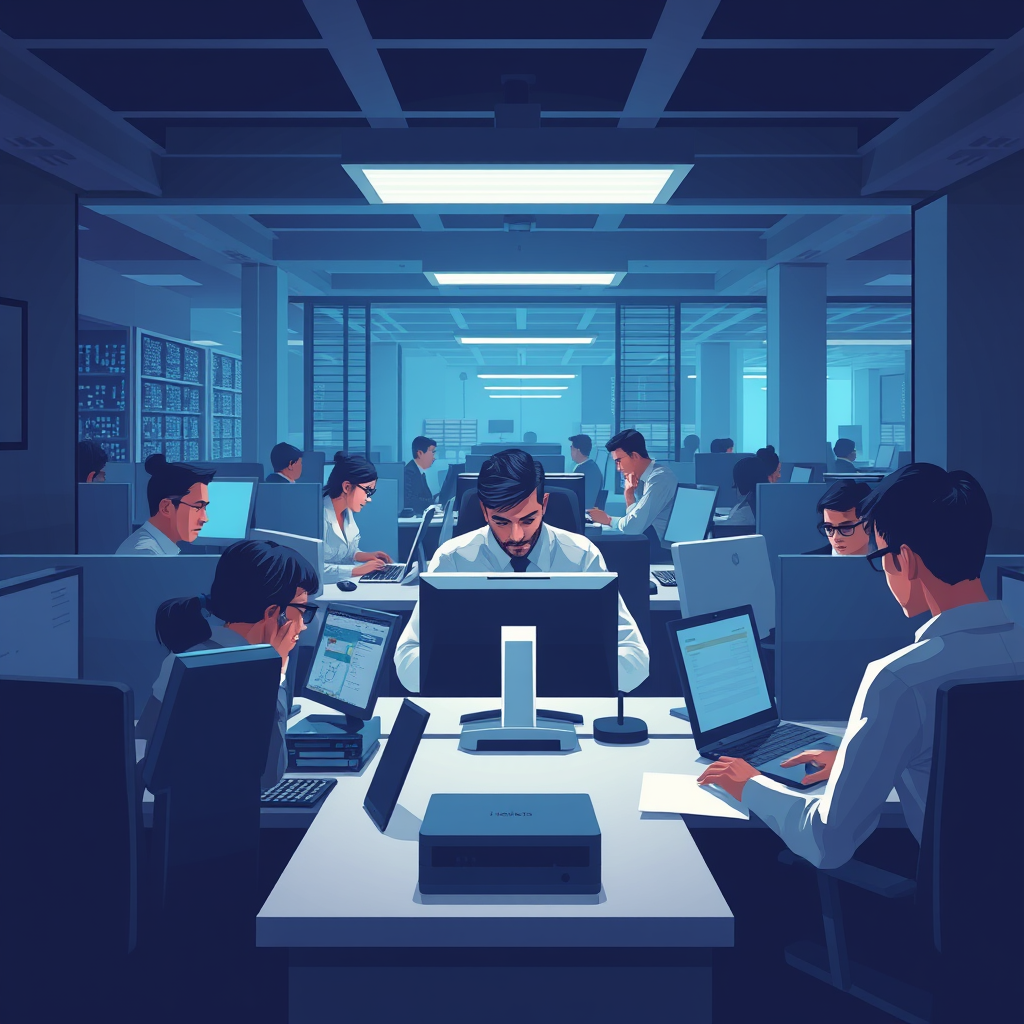 11 usersRealism: An AI tool that generates tense, high-tech office illustrations. Capture the intensity of modern workplaces with confined spaces, focused workers, and cool artificial lighting in a contemporary realist style.
