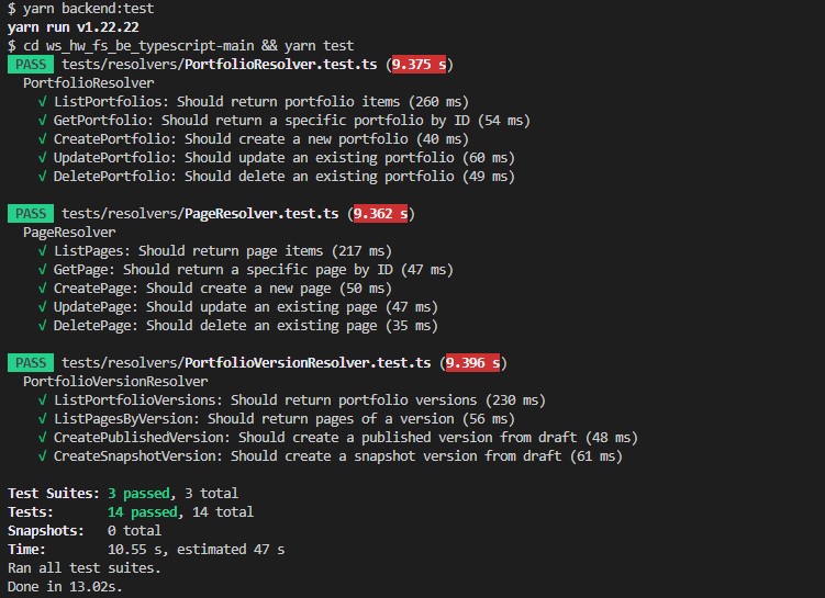 I used Jest for unit testing to make sure that all functionalities work as expected. I also created additional test helpers including creating portfolios, versions, moving pages between versions and deleting portfolios along with their related entities.