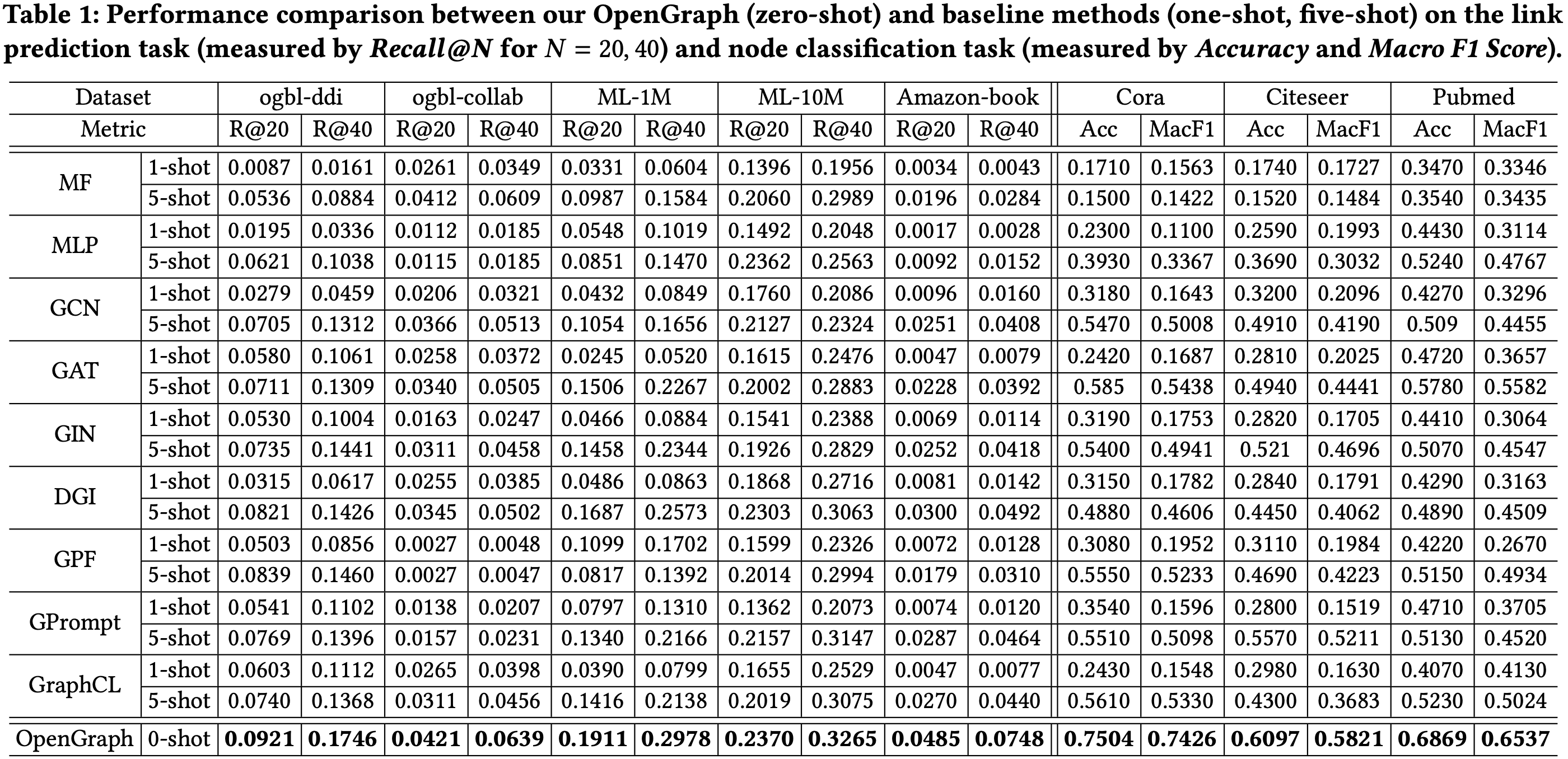 OpenGraph achives best performance under the 0-shot setting, compared to baselines trained/tuned with 1-shot and 5-shot data.