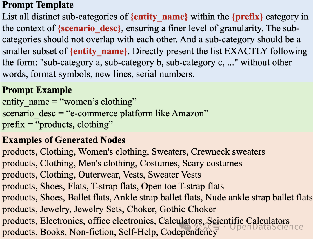Below shows our prompt template, as well as examples for prompt configurations and generated nodes.