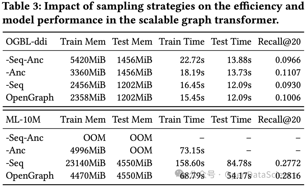 We ablated the two sampling techniques in the graph transformer, and show their positive effects on both memory and time costs below. Suprisingly, token sequence sampling shows a positive effect over the model performance.