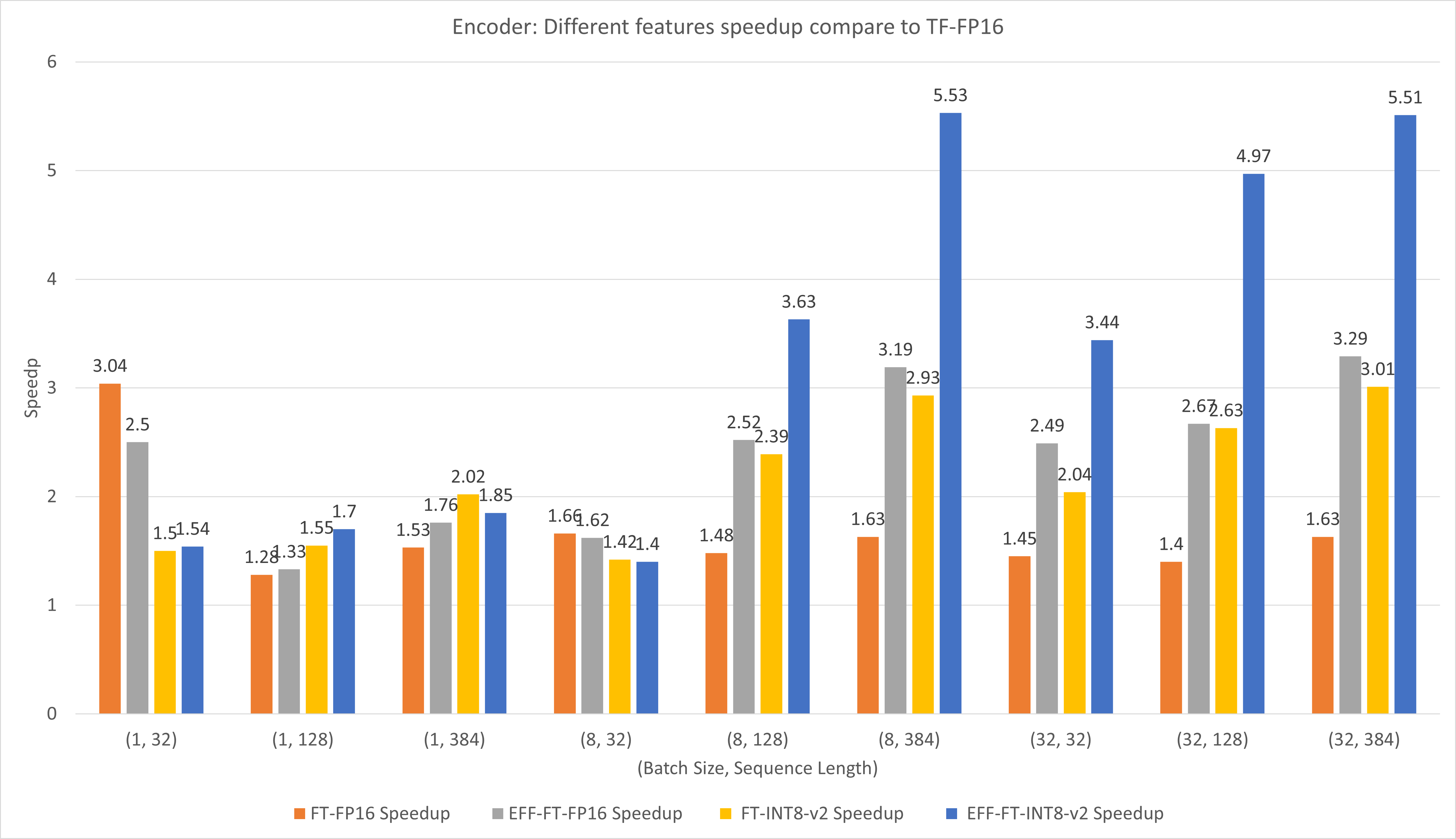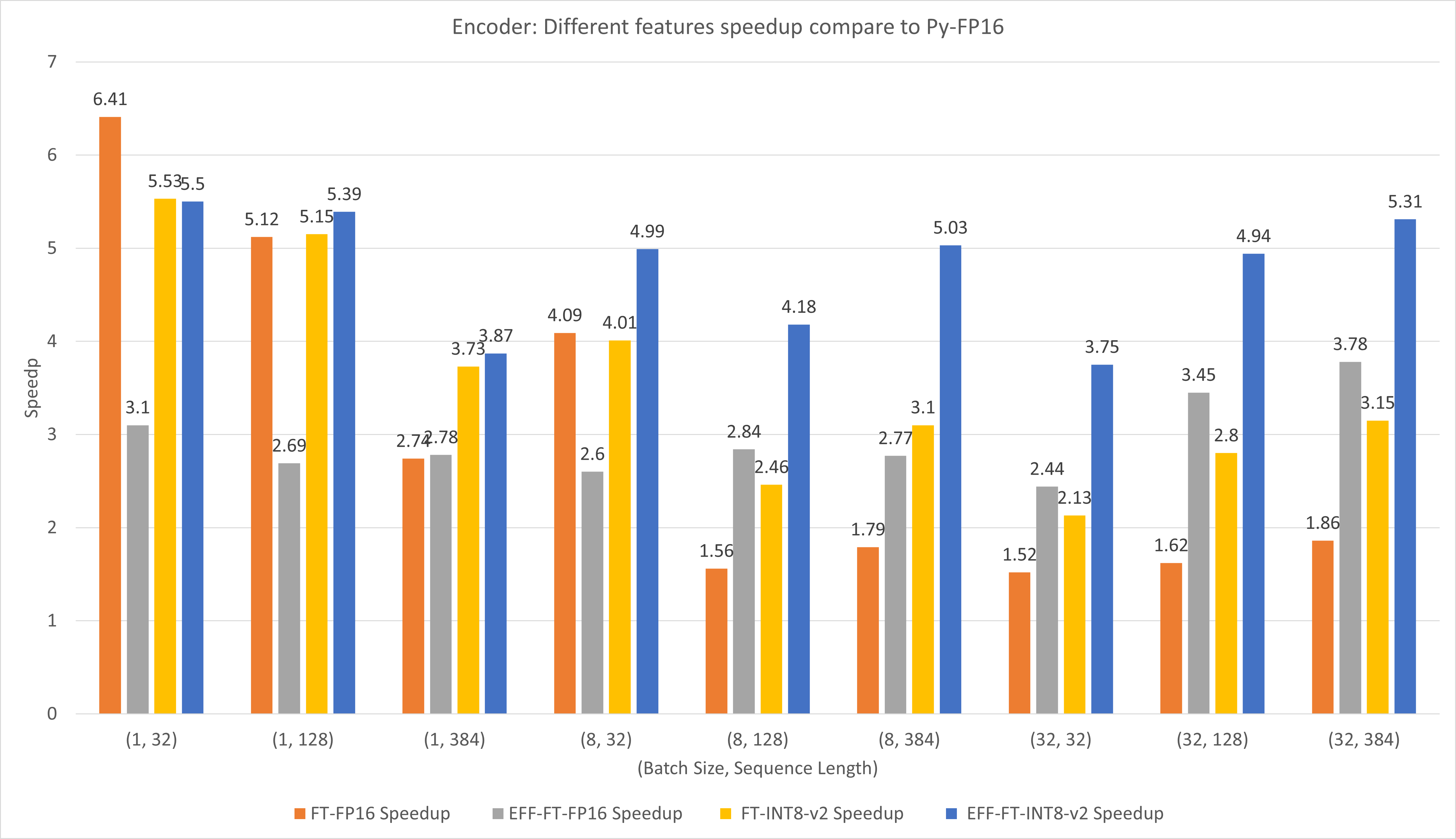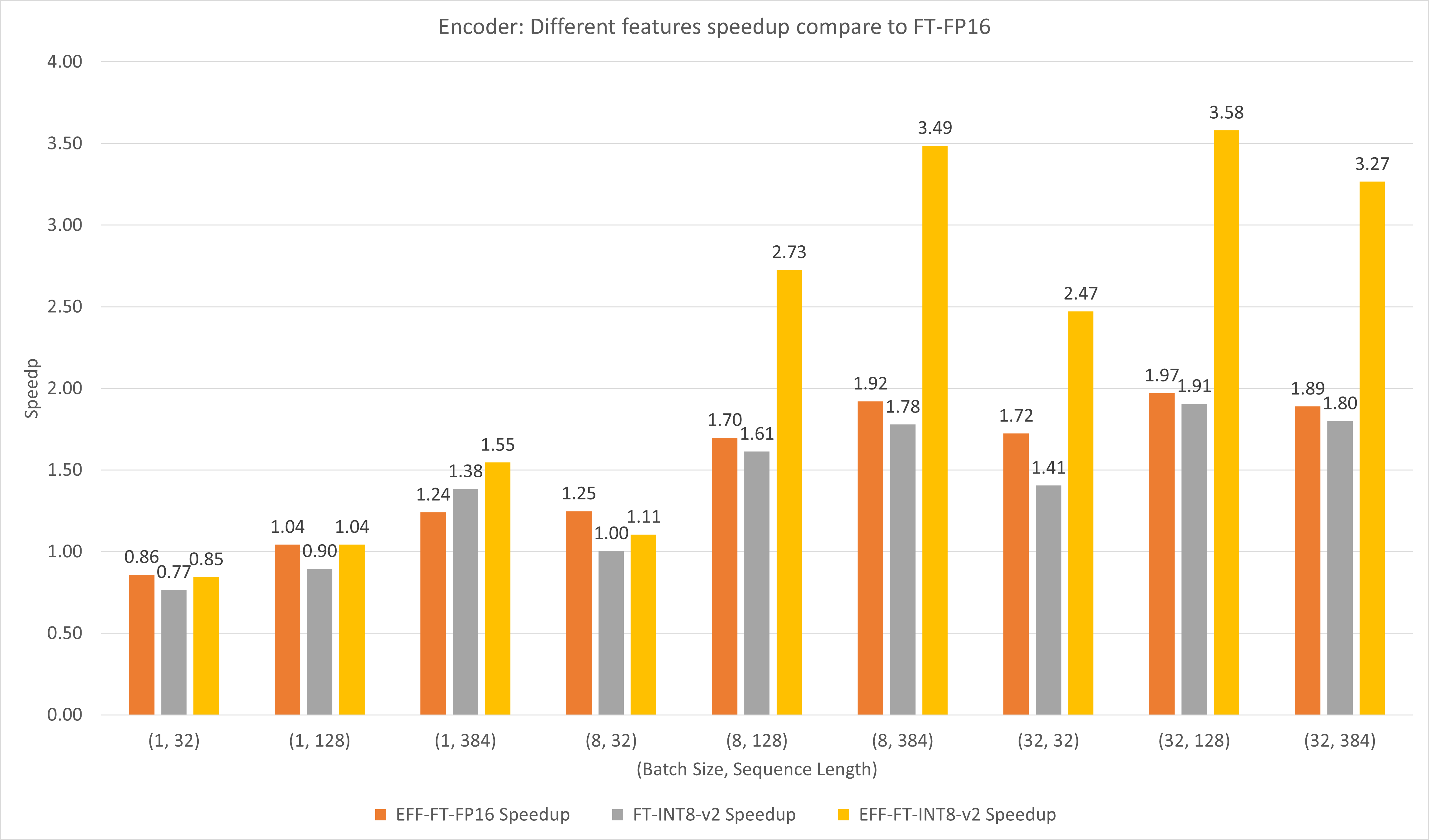 For large batch size and sequence length, both EFF-FT and FT-INT8-v2 bring about 2x speedup. Using Effective FasterTransformer and int8v2 at the same time can bring about 3.5x speedup compared to FasterTransformer FP16 for large case.