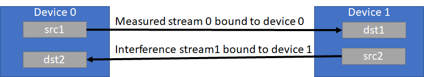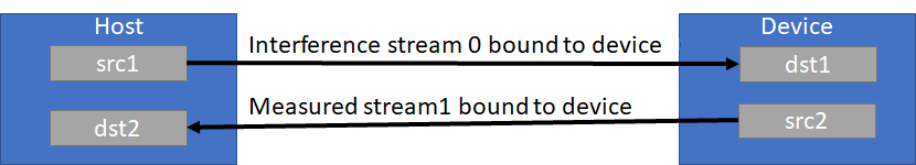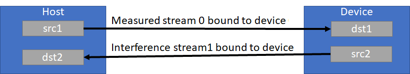 Stream 0 (measured stream) performs writes to the device, while the interfering stream in the opposite direction produces reads. This pattern is reversed for measuring bidirectional device to host bandwidth as shown below.