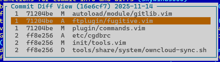第一列是 parent commit 的序号,第二列是 parent commit 的 hash 后面两列是文件改动状态和文件名,此时按 j/k 移动光标,回车查看具体文件改动。