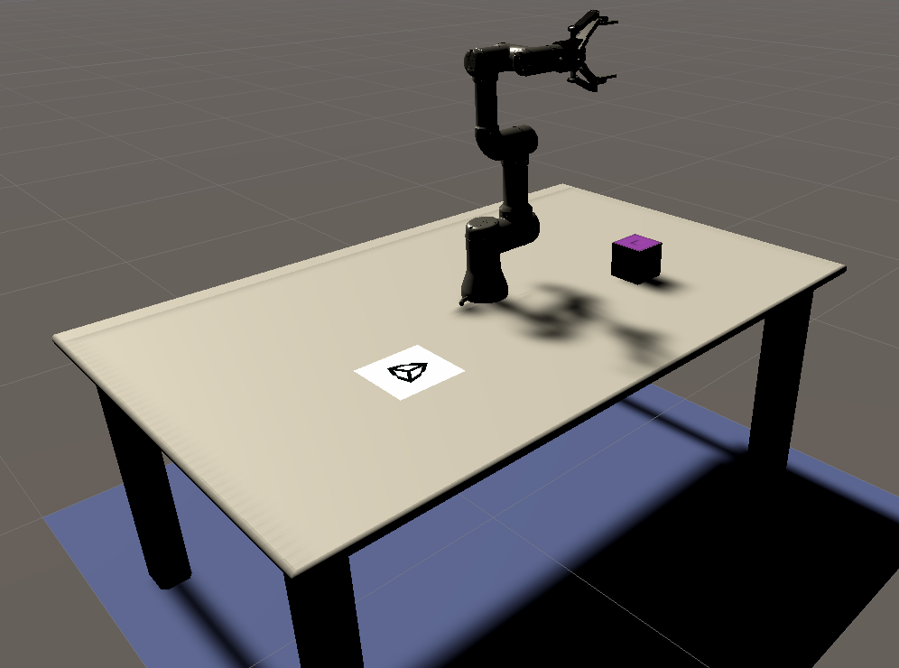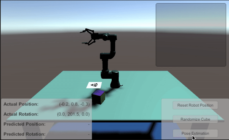 A complete end-to-end demonstration in which we collect training data in Unity and use that data to train a deep neural network to predict the pose of a cube. This model is then deployed in a simulated robotic pick-and-place task.